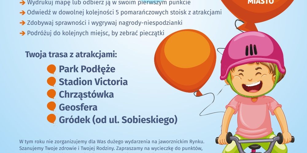 W tym roku nie zorganizujemy dla Was dużego wydarzenia na jaworznickim Rynku. Szanujemy Twoje zdrowie i Twojej Rodziny. Zapraszamy na wycieczkę do punktów, które zorganizowaliśmy specjalnie dla Was w różnych częściach miasta. Tu odpoczniecie i zdobędziecie sprawności. Otrzymacie też nagrody.